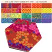 42 hexagon-klippede stykker stof på ca. 12 cm. Se flere mønstre i pakken i INFO.