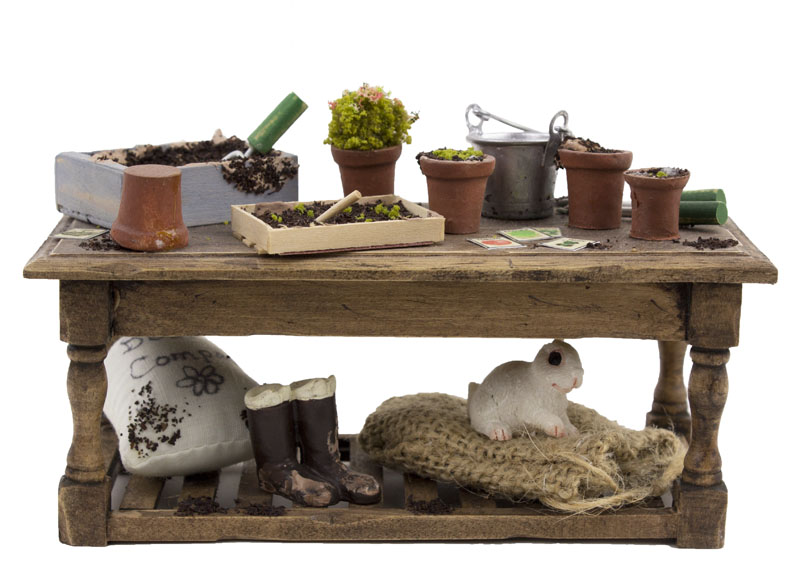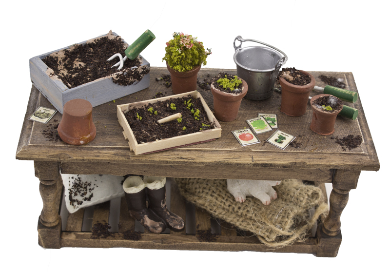 Arbejdsbord med haveremedier. SE også andet billede i INFO. Mål ca B 14 cm, D 6,5 cm, H 8,5 cm.