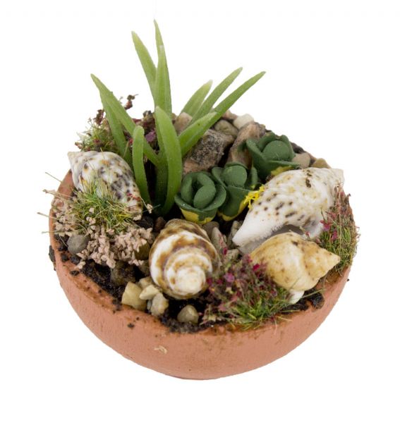 Lerskål med beplantning smykket med sten og konkylier. Mål ca. Ø 3 cm, H 3,5 cm.