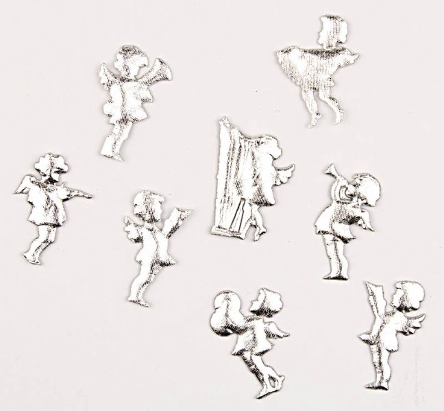 Pose med 8 små stoflige engle i sølvlook der spiller forskellige instrumenter. Ca. 3 cm høje.