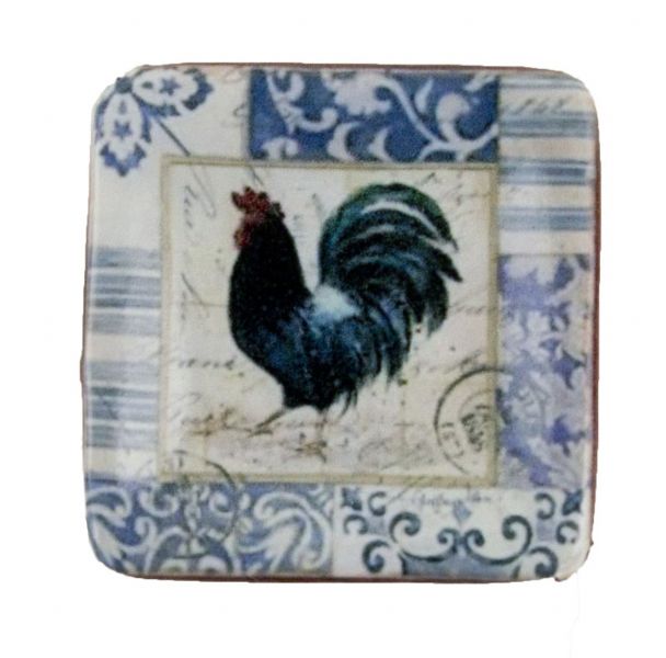 Firkantet tallerken med hane-motiv. Mål ca. 2 x 2 cm.