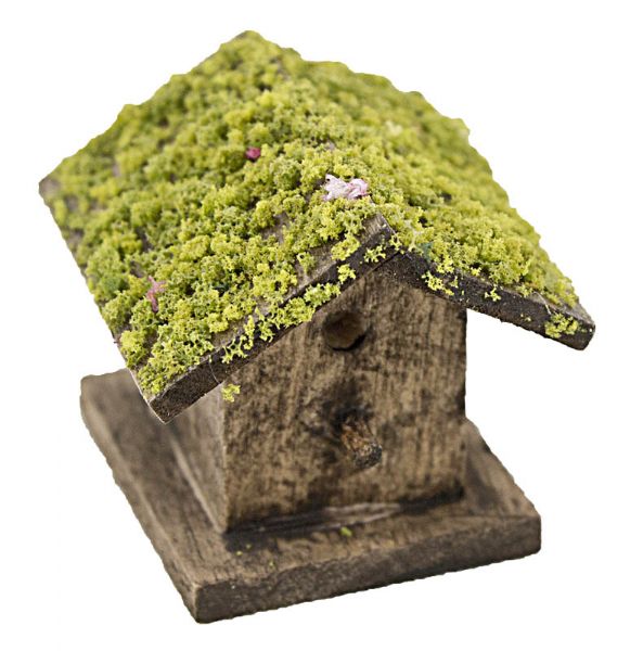 Beskrivelse Fuglehus med mos på taget. Måler ca. 3 x 2,8 cm. H 2,7 cm.