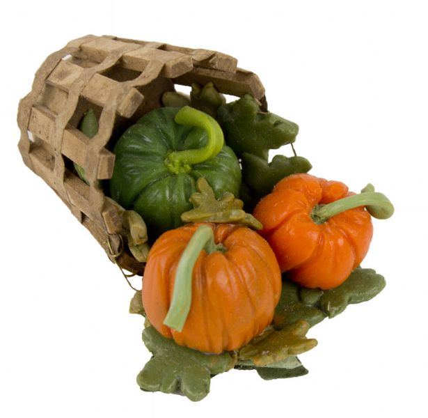 Græskar i væltet kurv. Måler ca. L 4,5 cm, B 3,5 cm, H 2,8 cm.
