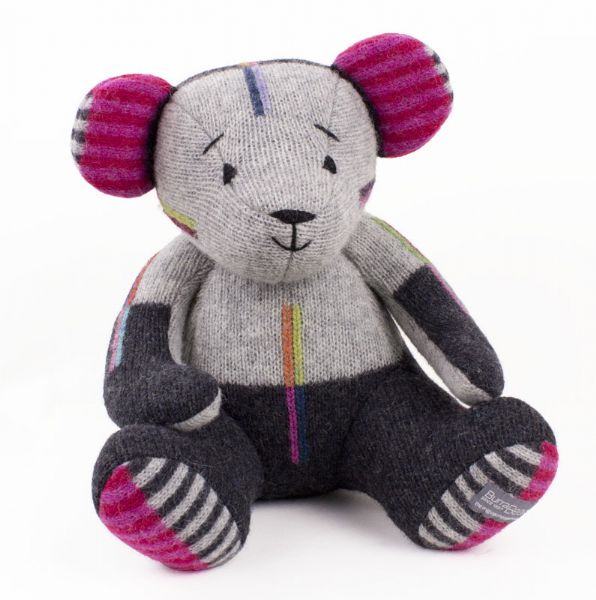 Sort-grå bamse med enkle kulørte striber og stribede ører og bagpoter i rød-pink og sort-grå. Måler ca. 28 cm.