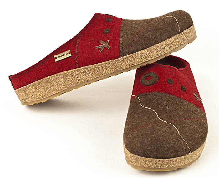 Grizzly Tristan fra Haflinger er en hjemmesko i brun og rød med filtpynt og farvede stiklinger. Skoen er af filtet uld og sålen er en fast, skridsikker gummisål med korkindlæg.