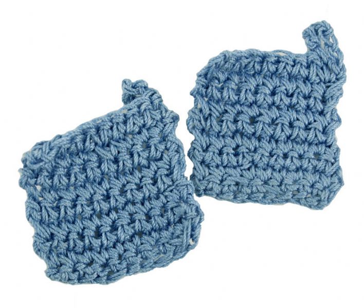 Et par hæklede blå grydelapper. Firkantede. Mål ca. 2 x 2 cm.