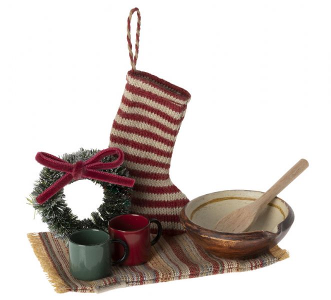 Julehygge sæt bestående af et lille tæppe, 2 krus, en julekrans, en julesok, en stor skål med grydeske. Måler ca. 7 x 9 x 3,5 cm.