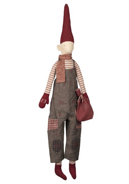 Kalendernisse, dreng, med 24 ringe eller lommer til små kalendergaver. Han har strop i nakken så han kan hænge. Ca. 121 cm.