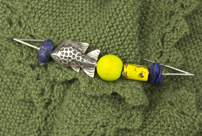 14 cm lang brochenål med lapiz, gul turkis, afrikansk glas og stor dekorativ sølvfisk.