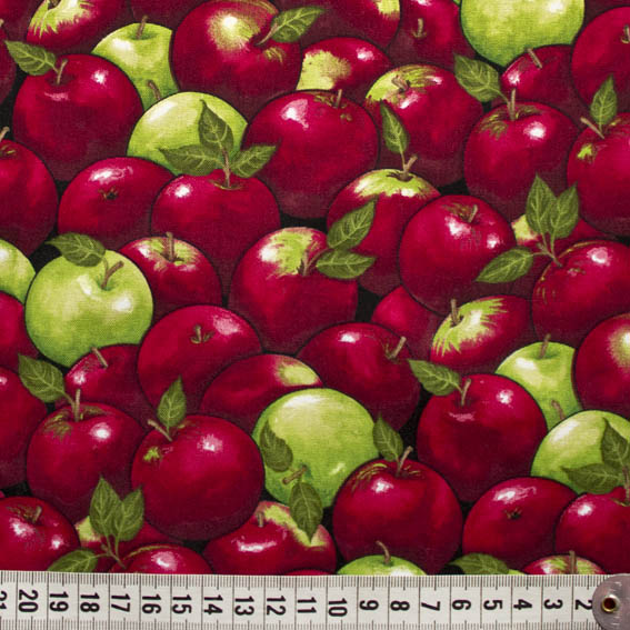 | Stof "æbler": mørkerøde og grønne æbler med lidt blade, sort kontur og bund (50cm enhed) | Ikke angivet | DKK 74,00 | Læg i kurv | |||