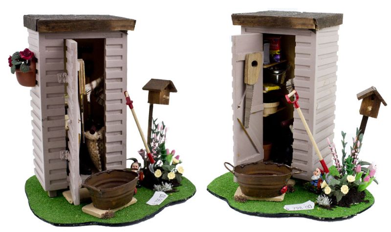 Lille redskabsskur med redskaber, sæk med jord, gummistøvler, hylder med spand, havehansker, gødning og diverse. Udenfor et blomsterbed med fuglehus, spade, havenisse og en gammel vaskebalje. Mål ca. 14 x 15 cm, H 15,5 cm.