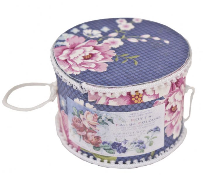 Beskrivelse Rund blå æske med snor. Låget kan åbnes. Mål ca. Ø 4 cm, H 2,8 cm.