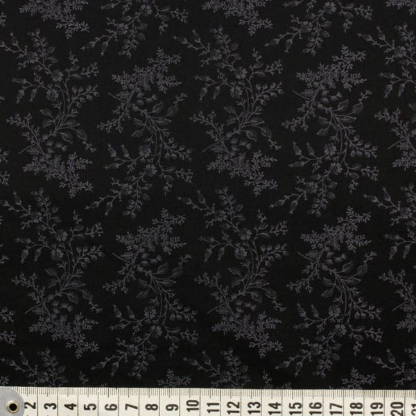 Sort med fine små grå blomster og blade på tynde stilke.Stoffet er 110 cm bredt og sælges i 50 cm's enheder.