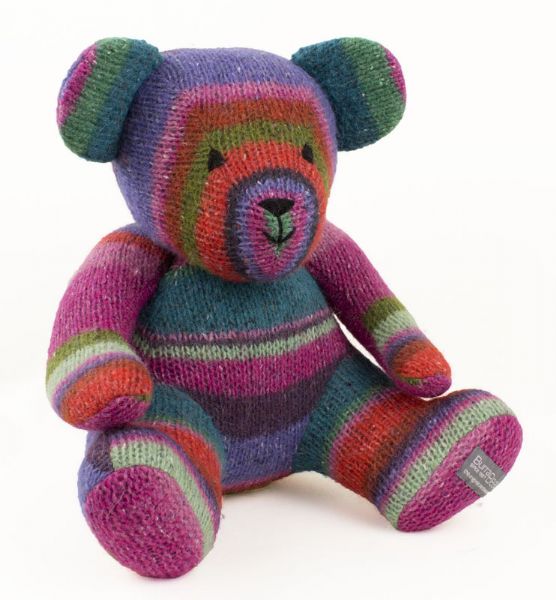 Bamse i kulørte strikkede striber. Måler ca. 28 cm.