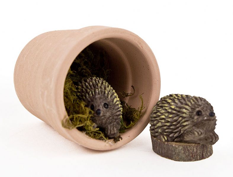 Urtepotte med pindsvin og pindsvin og lille træskive. Urtepotten måler ca. Ø 4 cm, H 4,4 cm. Det løse pindsvin er ca. 2,7 cm lang.