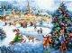 Broderikit af julepyntet by og frossen sø. Ca. 38 x 28 cm. Kittet består af 16 count lyseblå aida stof, bomuldsgarn, nål og mønster.