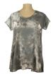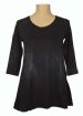 A-formet T-shirt i 92% rencel, 8% elastan. Rund hals og 3/4 ærmer. Håndfarvet. Sort med lysere "bælte" over livet og nederst på ærmerne. Længde fra skulder i str. 1 ca. 67 cm. Vælg størrelse. (OBS: fordi bluserne er håndfarvede vil det lysere bælte være en smule forskelligt fra bluse til bluse.)
